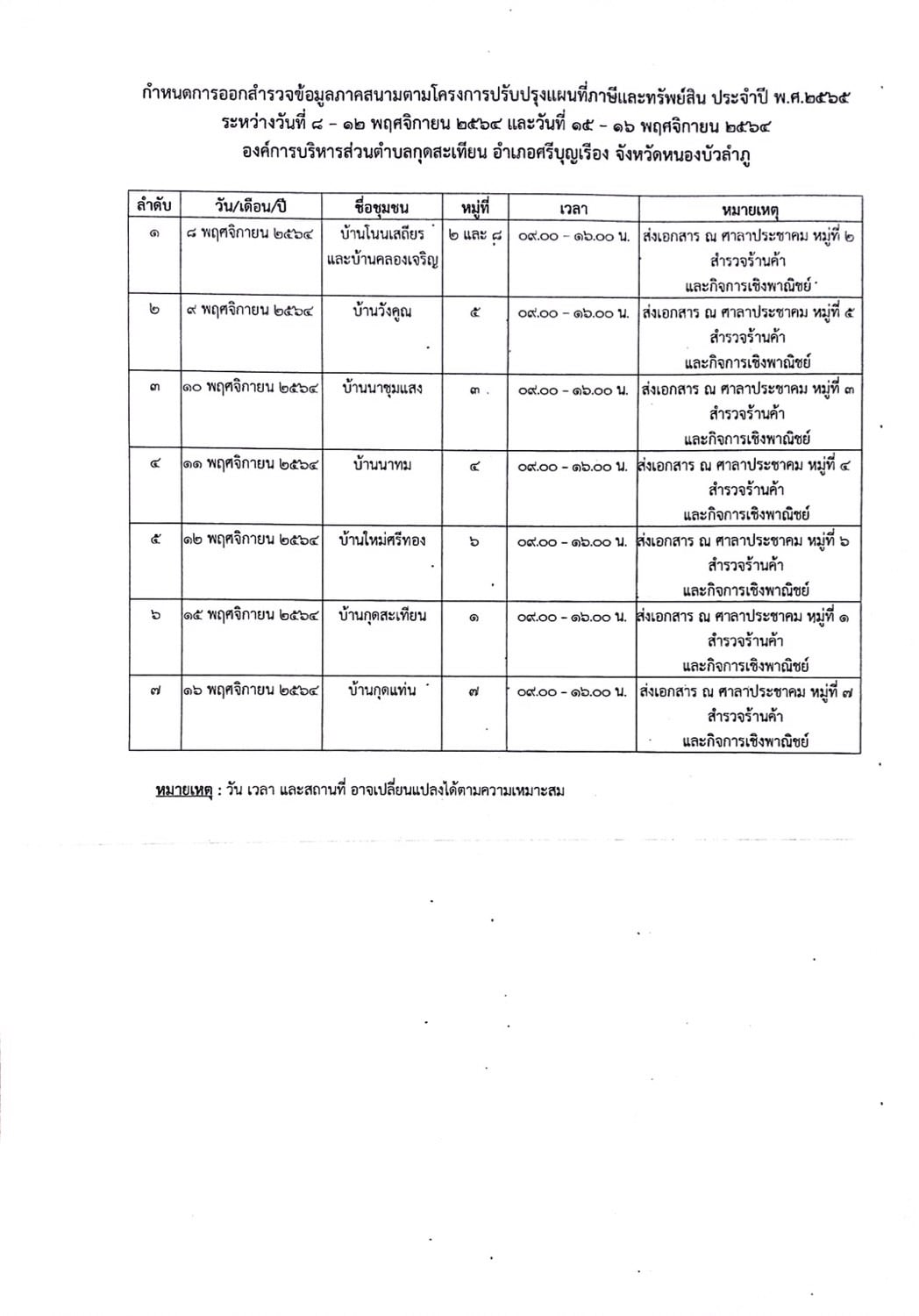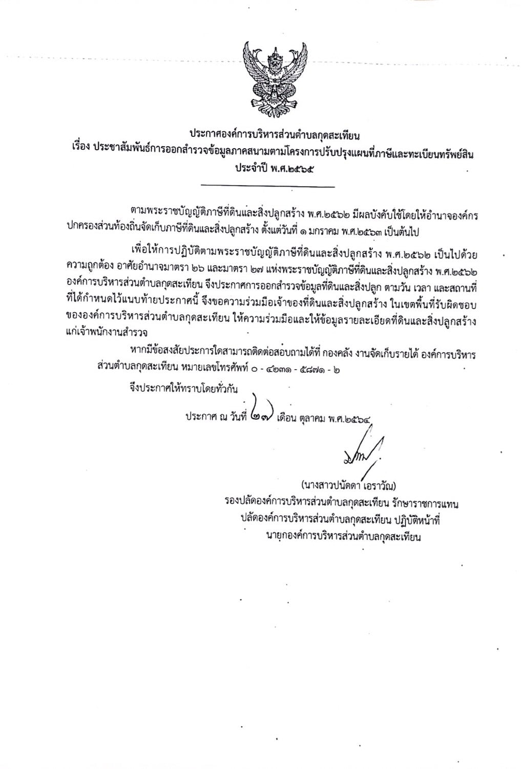 องค์การบริหารส่วนตำบลกุดสะทียน ประกาศเรื่อง กำหนดการออกสำรวจข้อมูลภาคสนามตามโครงการปรับปรุงแผนที่ภาษีและทรัพย์สิน ประจำปี พ.ศ.๒๕๖๕